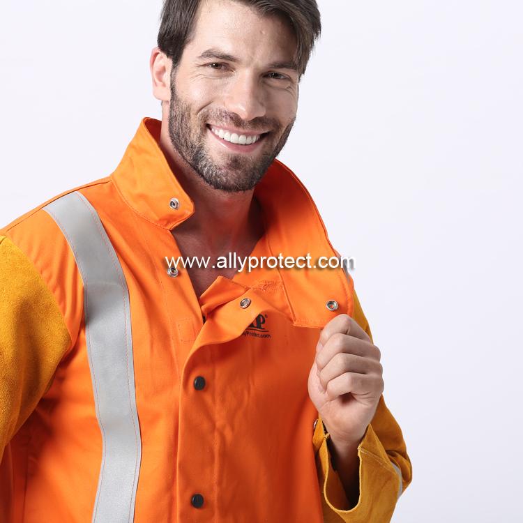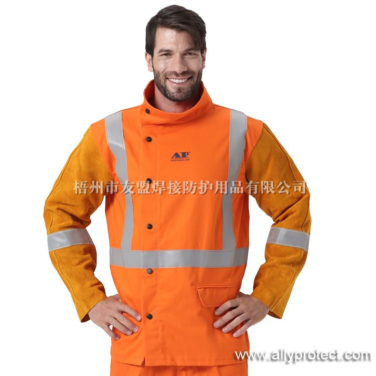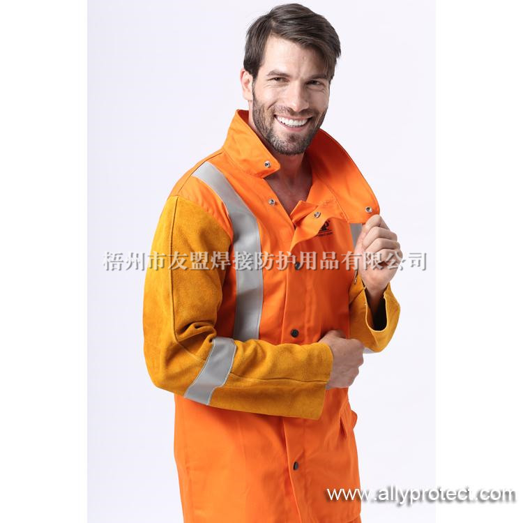 - 產(chǎn)品描述: 衣袖采用金黃色牛二層皮,衣身采用橙紅色防護阻燃布,專為焊工在炎熱環(huán)境下工作而設(shè)計。帶反光條設(shè)計,提高作業(yè)安全性。